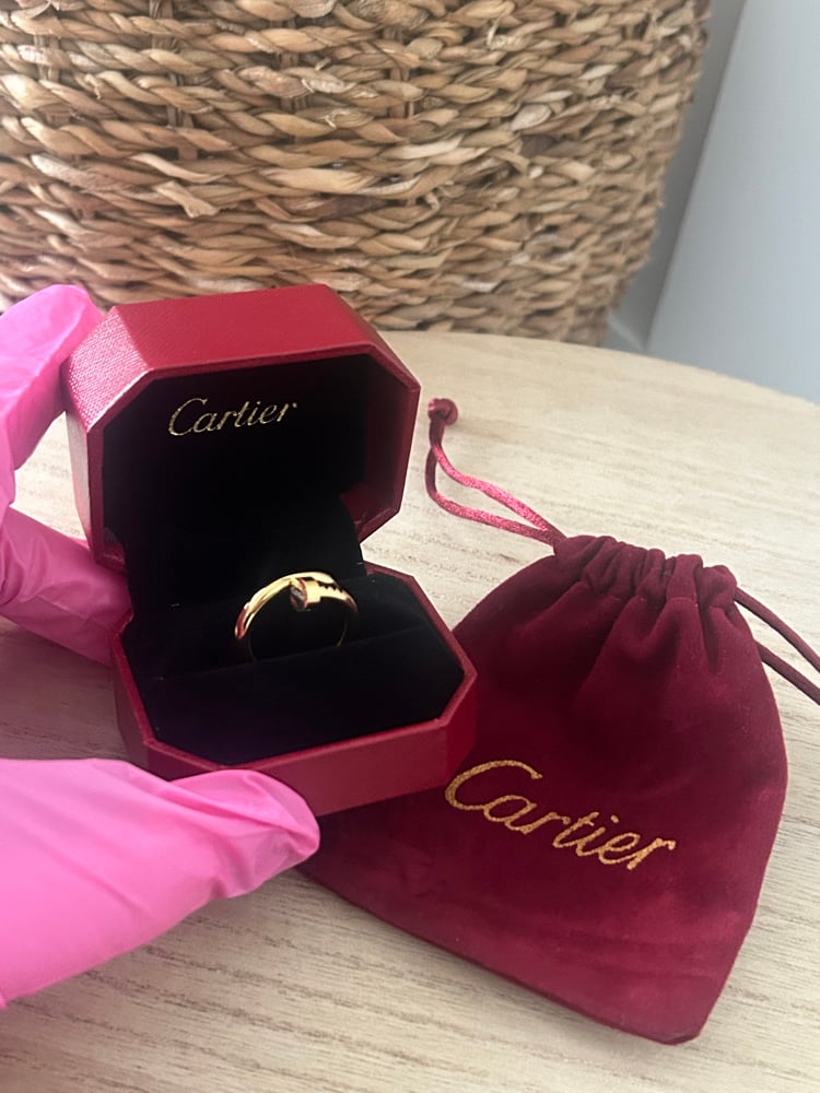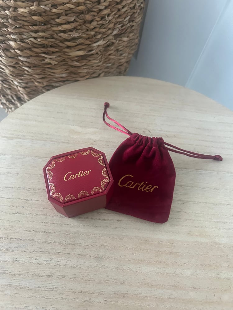 Gold ring with box and matching pouch.